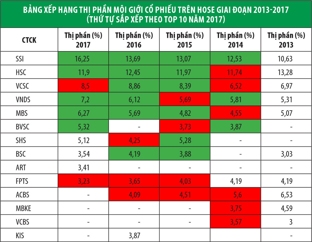 Ở các năm trước (giai đoạn 2013-2016), các công ty chứng khoán trong TOP 2 thường có mức thị phần từ 10-13%, vị trí 3-5 là 6-9% thị phần, còn lại là dưới 5%. Tuy nhiên, trong năm 2017, đã có sự "tách nhóm" ở hai vị trí dẫn đầu.