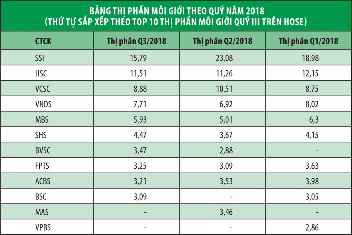 Cuối tháng 9 vừa qua, tuy thị trường chứng khoán Việt Nam đón nhận một thông tin tích cực khi được FTSE Russell đưa vào danh sách theo dõi nâng hạng lên thị trường mới nổi hạng 2, nhưng những hệ lụy từ đợt điều chỉnh dài trước đó, cộng với các yếu tố khách quan như căng thẳng chiến tranh thương mại Mỹ - Trung Quốc gia tăng, biến động tỷ giá… cũng tác động phần nào đến tâm lý nhà đầu tư, gây ảnh hưởng không nhỏ đến thị phần của các công ty chứng khoán trong quý III/2018.
