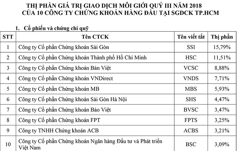 Top 6 trong bảng xếp hạng thị phần môi giới vẫn giữ nguyên so với quý II/2018, với sự dẫn đầu là SSI. Tuy nhiên, thị phần môi giới của SSI trong quý này đã giảm đáng kể từ 23,08% xuống còn 15,79%.