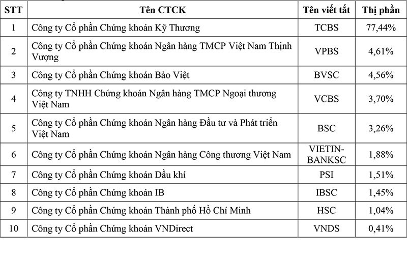 Về thị phần môi giới trái phiếu, số lượng công ty chứng khoán tham gia giao dịch môi giới trong quý IV/2017 là 10 công ty. Trong đó, Chứng khoán Kỹ Thương (TCBS) tiếp tục dẫn đầu toàn thị trường với thị phần đạt 77,44%. Đứng ở vị trí thứ 2 là VPBS với thị phần đạt 4,61%.