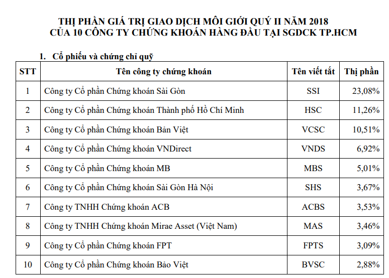 Tính chung 6 tháng, SSI dẫn đầu với thị phần 20,91%, kế đến là HSC 11,73%, VCI với 9,58%...