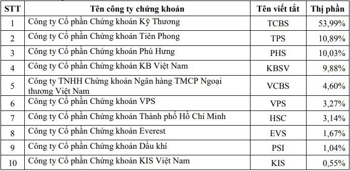 Đáng chú ý, ngay sau khi trở lại trong quý I/2020, MBKE đã nhanh chóng bị đánh bật khỏi bảng xếp hạng Top 10 trong quý này, thay vào đó là sự xuất hiện của TCBS đứng ở vị trí thứ 10 với thị phần đạt 3,49%.
