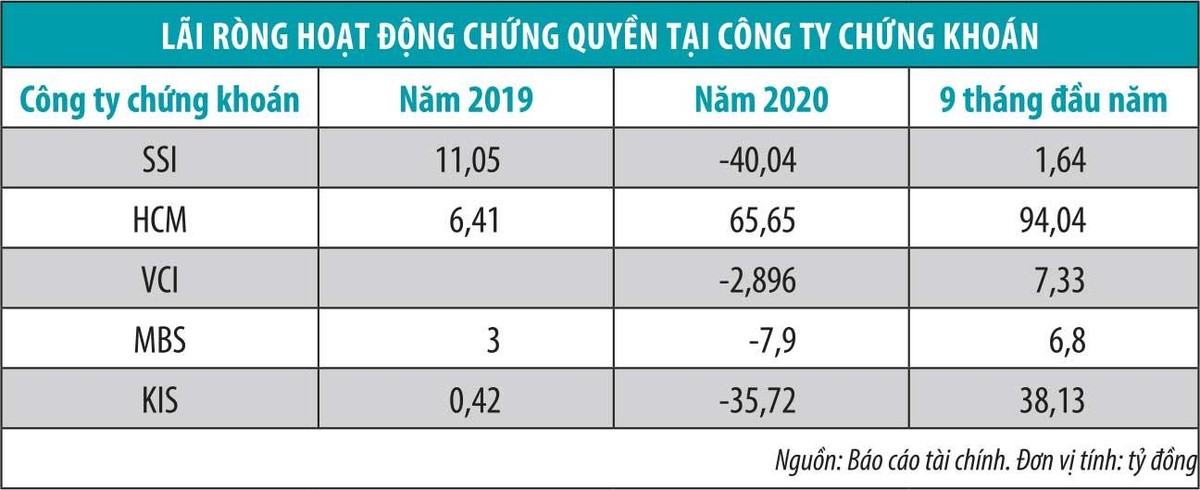Chỉ riêng với sản phẩm chứng quyền, thống kê tại 5 công ty chứng khoán thường xuyên phát hành chứng quyền gồm Chứng khoán SSI (mã SSI), Chứng khoán TP.HCM (mã HCM), Chứng khoán Bản Việt (mã VCI), Chứng khoán KIS Việt Nam (mã KIS) và Chứng khoán MB (mã MBS), trong 9 tháng đầu năm 2021, lợi nhuận đem về tích cực hơn so với cả năm 2020.