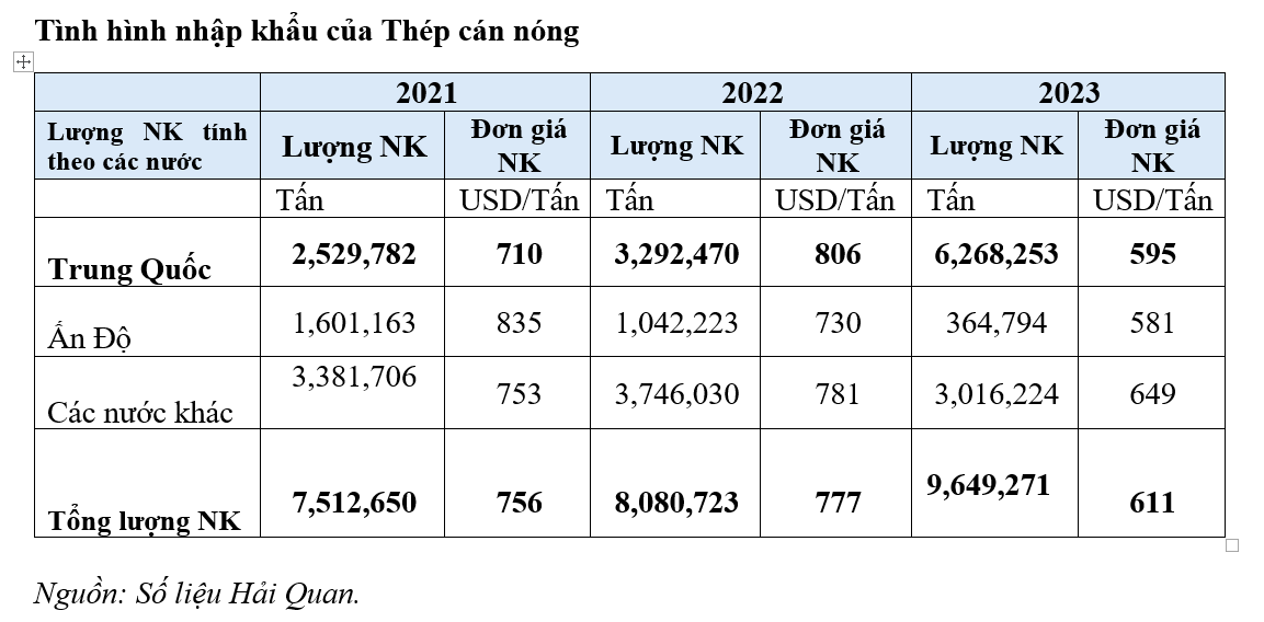 Đơn giá nhập khẩu trung bình từ Trung Quốc và Ấn Độ bình quân là 595 USD/tấn, thấp hơn nhiều so với giá nhập khẩu từ các nước khác là 649 USD/tấn. Giá nhập khẩu từ 2 thị trường này giảm 20-26% so với năm 2022và xu hướng nhập khẩu thép cán nóng ồ ạt với giá rẻ vẫn đang được tiếp diễn ở những tháng đầu năm 2024 với lượng nhập khẩu 3 triệu tấn trong đó 2,3 triệu tấn nhập từ Trung Quốc cao hơn sản lượng 2 triệu tấn của sản xuất trong nước.