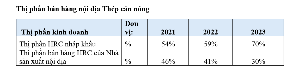 HRC nội địa đã có sự gia tăng và đầu tư về mặt công suất nhưng thị phần bán hàng nội địa sụt giảm đáng kể, đặc biệt là trong năm 2023 giảm xuống còn 30% so với 46% năm 2021. Thép HRC nhập khẩu chiếm 70% thị phần từ mức 54% năm 2021. Cụ thể, nhập khẩu năm 2023 là 9,64 triệu tấn HRC, trong đó nhập từ Trung Quốc là 6,28 triệu tấn. Lượng nhập khẩu HRC cao hơn gần 140% so với lượng sản xuất thực tế của các nhà sản xuất HRC tại Việt Nam.