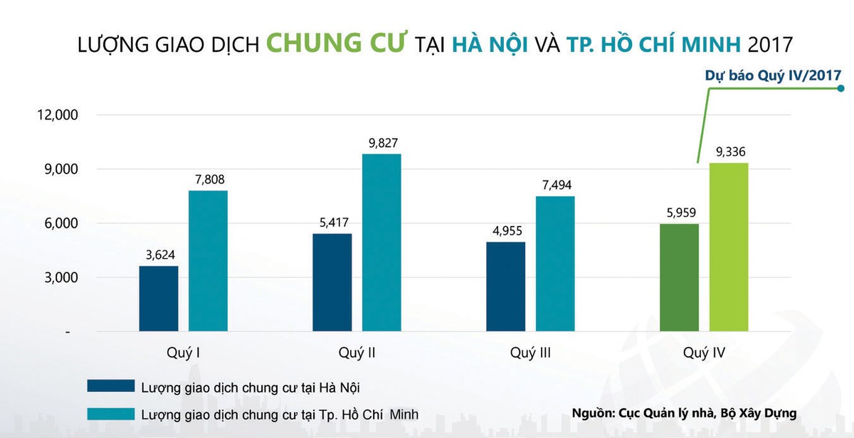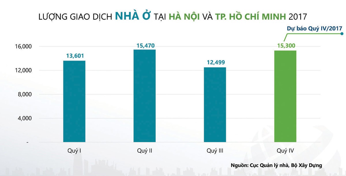 Quý cuối cùng của năm 2017, đúng như dự đoán, thị trường có sự sôi động mạnh. Dù chưa có số liệu chính thức, nhưng thống kê sơ bộ theo VNREA, tổng lượng giao dịch tại Hà Nội và TP.HCM ước đạt con số 15.300 giao dịch, trong đó Hà Nội là 5.959 giao dịch và TP.HCM là 9.336 giao dịch. Điểm đáng lưu ý, theo khảo sát của phóng viên Báo Đầu tư Bất động sản, trong quý cuối năm, giao dịch bất động sản cao cấp đã có sự sôi động hơn so với các quý đầu năm. Các dự án tốt của những chủ đầu tư lớn như Vingroup, Sun Group, Việt Hưng, Phát Đạt… đều có giao dịch cải thiện so với đầu năm.