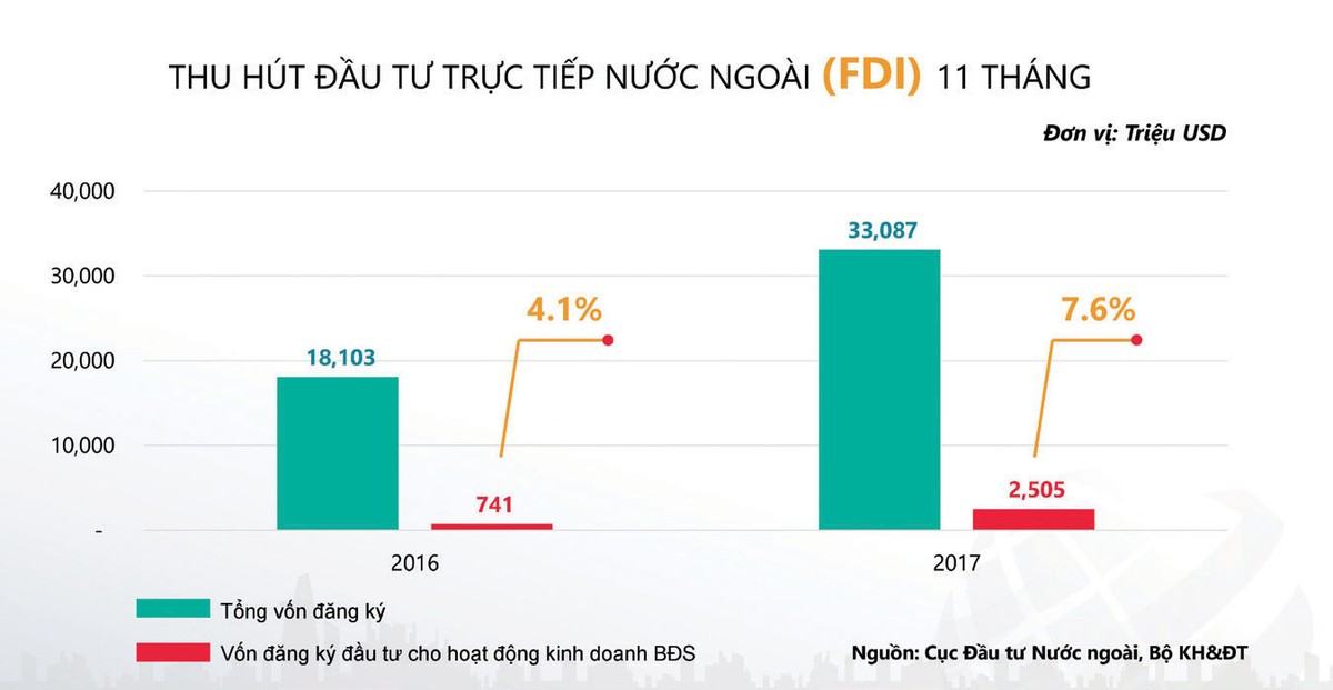 Một điểm đáng chú ý nữa của thị trường bất động sản 2017 là sự bùng nổ các doanh nghiệp thành lập mới trong lĩnh vực này. Cụ thể, theo số liệu của Cục Quản lý đăng ký kinh doanh (Bộ Kế hoạch và Đầu tư), trong 11 tháng năm 2017, có 4.500 doanh nghiệp kinh doanh bất động sản được thành lập mới, tăng 60% về số doanh nghiệp và số vốn, tăng 18,6% về lao động; 155.300 doanh nghiệp xây dựng thành lập mới, tăng 9% về số doanh nghiệp và 28% về vốn.