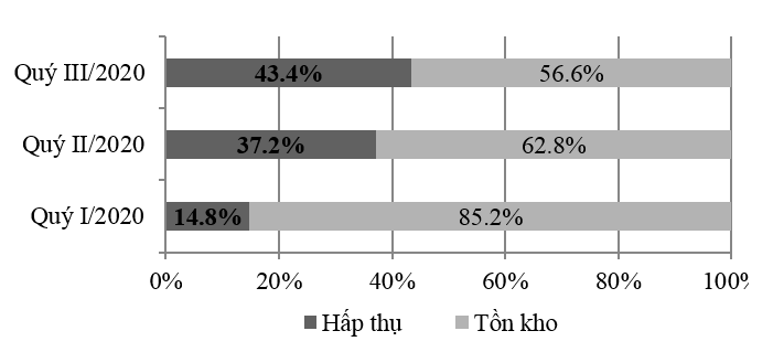 Đối với 22.602 sản phẩm mới được chào bán trong quý III/2020, tỷ lệ giao dịch là 9.813/22/602 sản phẩm, tương đương tỷ lệ hấp thụ 43,4%, cao hơn nhiều tăng khoảng 3,54 lần so với quý I/2020 và 1,43 lần so với quý II/2020.