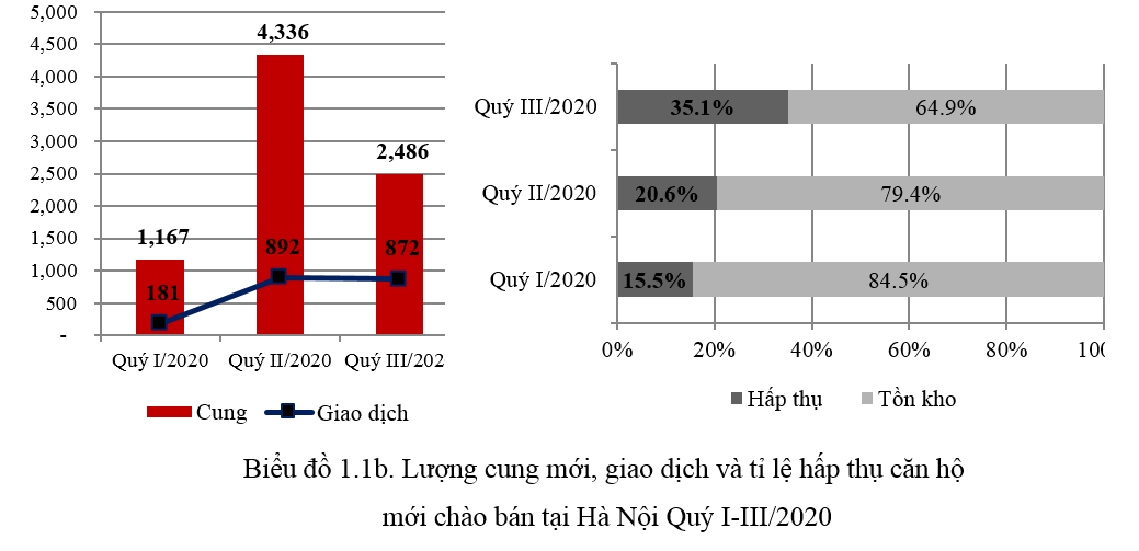 Đối với riêng từng thị trường cũng có sự phân hóa khá rõ rệt, khi tổng lượng sản phẩm được bán trên toàn thị trường Hà Nội quý III/2020 đạt 13.300 sản phẩm (chủ yếu là căn hộ chung cư), giao dịch 2.966/13.300 sản phẩm, tương ứng tỉ lệ hấp thụ đạt 22,3%.