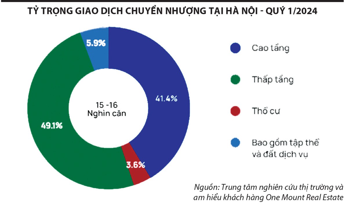 Theo số liệu của Trung tâm Nghiên cứu thị trường và Am hiểu khách hàng One Mount Real Estate, riêng tại Hà Nội, trong quý I/2024, số lượng giao dịch bất động sản ước đạt khoảng 15.000-16.000 giao dịch, trong đó phần lớn là giao dịch chuyển nhượng nhà thấp tầng với tỷ trọng hơn 49%, tiếp theo là chung cư cao tầng với tỷ trọng hơn 41%.