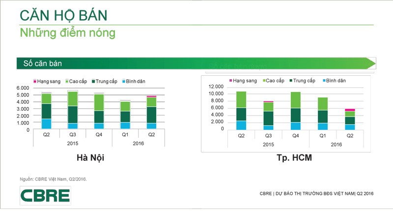 Cụ thể, tại TP. HCM, trong quý II/2016, nguồn cung thị trường căn hộ bán có tổng cộng 10.107 sản phẩm mới, tăng 20% so với quý trước, nhưng giảm 9% cùng kỳ. Tại Hà Nội, tổng cộng có 6.100 căn hộ được mở bán mới từ 17 dự án, tăng 19% so với quý trước, nhưng giảm 23% cùng kỳ. Trong quý II ghi nhận sự trở lại của phân khúc cao cấp, bao gồm lượng căn hộ mở bán mới từ 3 dự án, cung cấp cho thị trường khoảng 700 căn.