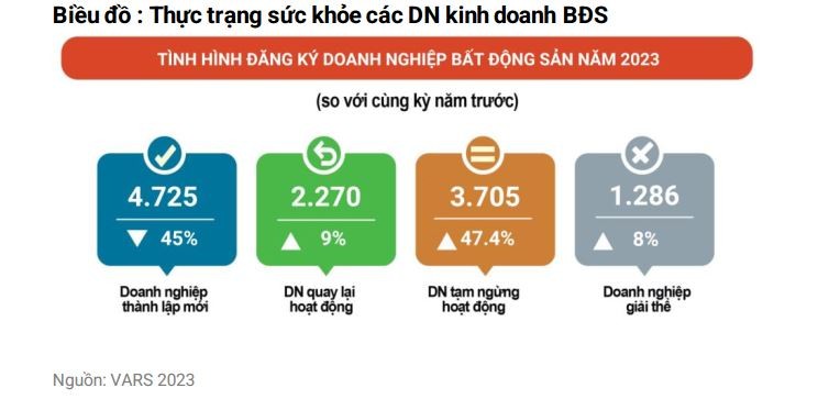 Số liệu của Tổng cục Thống kê cho thấy, năm 2023 có 1.286 doanh nghiệp giải thế, tăng 7,7% so với năm 2022 (năm 2022 tăng tới 38,7% so với năm 2021), 3.705 doanh nghiệp bất động sản ngừng có thời hạn, tăng 47,4%. Trong khi đó, số doanh nghiệp bất động sản thành lập mới đạt 4.725, giảm 45%; có 2.270 doanh nghiệp quay trở lại hoạt động, tăng 9,1%.