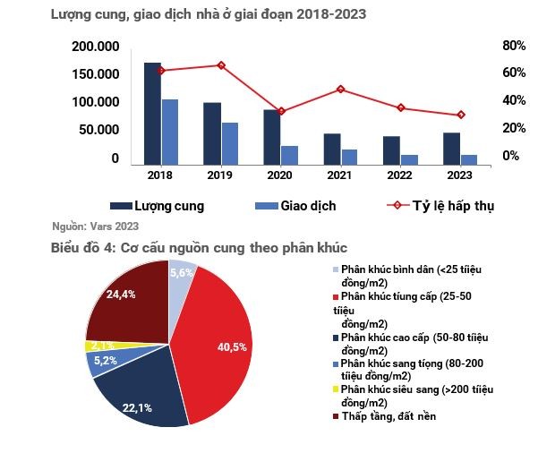 Điều tích cực là tỷ lệ hấp thụ tăng dần qua các quý, nhưng lượng giao dịch còn phụ thuộc nhiều vào số lượng nguồn cung. Tổng giao dịch 4 quý của năm 2023 lần lượt là: 2.700; 3.700; 5.778; 5.710 sản phẩm. Tổng giao dịch cả năm 2023 đạt 18.600 sản phẩm, tương đương với năm 2022 là 18.900 sản phẩm, nhưng chỉ bằng 17% so với năm 2018.