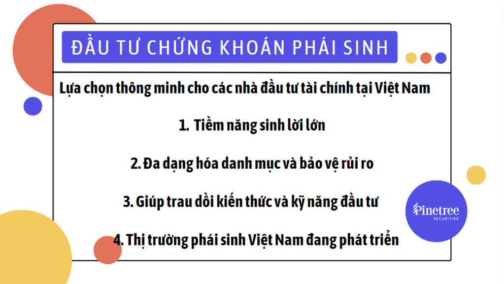 Chứng khoán phái sinh mang lại cơ hội sinh lời lớn với tính thanh khoản và đòn bẩy cao, các hợp đồng phái sinh như tương lai và quyền chọn cho phép nhà đầu tư tận dụng những biến động giá của thị trường cơ sở để kiếm lời. Ngoài ra, nhà đầu tư có thể sử dụng chứng khoán phái sinh như một công cụ phòng ngừa rủi ro (hedge) để bảo vệ khoản đầu tư vào chứng khoán cơ sở của mình khỏi những biến động không mong muốn trên thị trường.