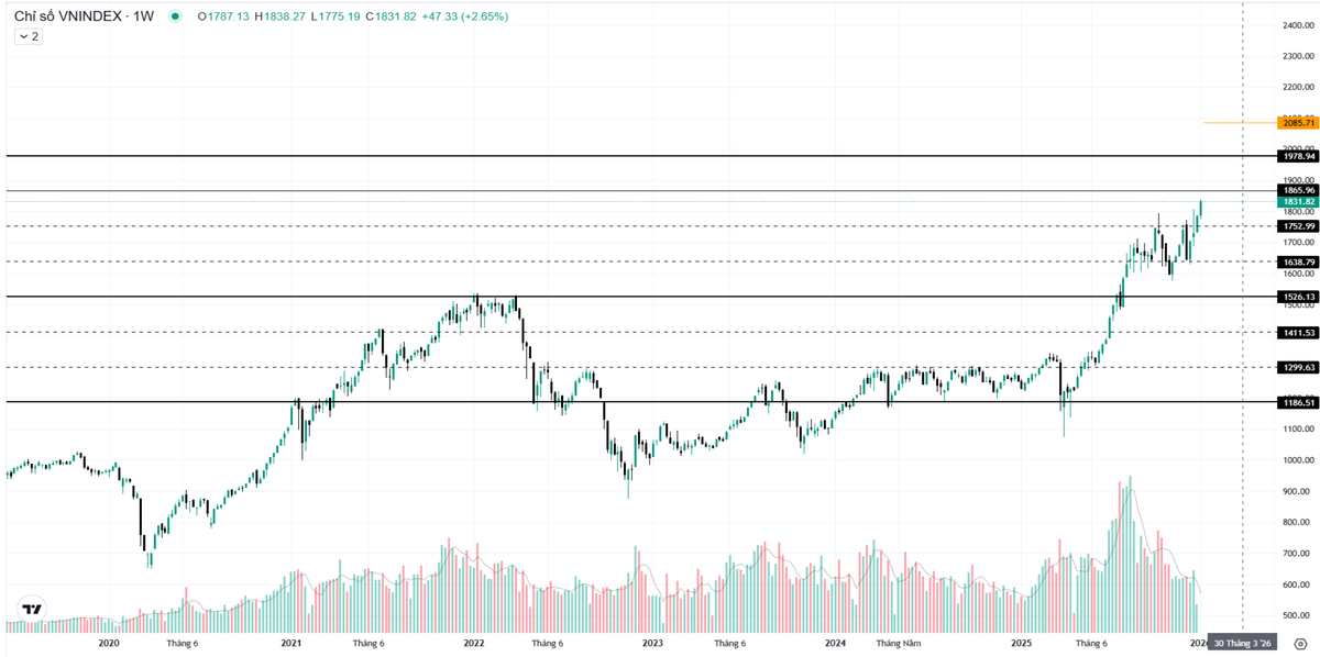 Kịch bản 1, thị trường xác nhận lên ngay từ tháng 1/2026. Vị thế của giá sẽ duy trì nhịp điệu tăng trên trung bình trượt ngày. Khi giá vượt qua đỉnh năm 2025, dòng tiền thể hiện cầu mua ngay khi có phiên rũ cung, điều chỉnh nhanh và mạnh. Vùng đỉnh cũ 1.700 - 1.740 điểm sẽ đóng vai trò là vùng hỗ trợ quan trọng, giúp thị trường duy trì trạng thái tăng.