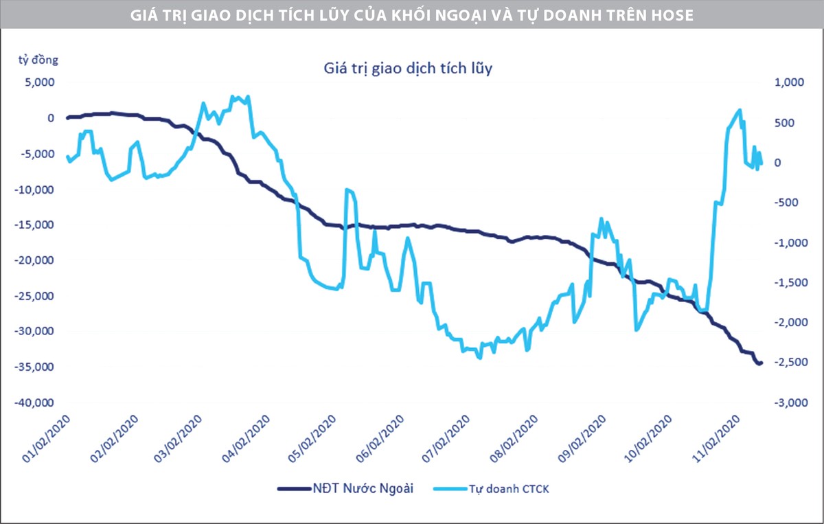 Nhà đầu tư nước ngoài trong tuần qua duy trì đà bán ròng, tổng giá trị bán ròng gần 1.500 tỷ đồng trên sàn HOSE. Ngoài ra, tự doanh công ty chứng khoán có động thái bán ròng trong ngắn hạn, nhưng đã chững lại so với tuần trước đó (tuần qua bán ròng 10 tỷ đồng, trong khi tuần trước đó bán ròng 444 tỷ đồng).