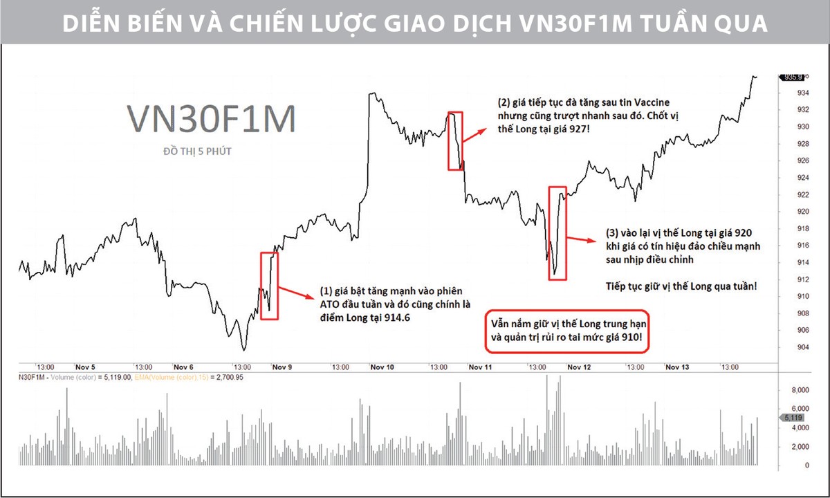 Chiến lược giao dịch trong ngắn hạn (tầm nhìn trong tuần từ ngày 16 - 20/11) được khuyến nghị là canh mua (Long) trong các nhịp chùng xuống của giá về khu vực hỗ trợ quanh 920 - 930 điểm.