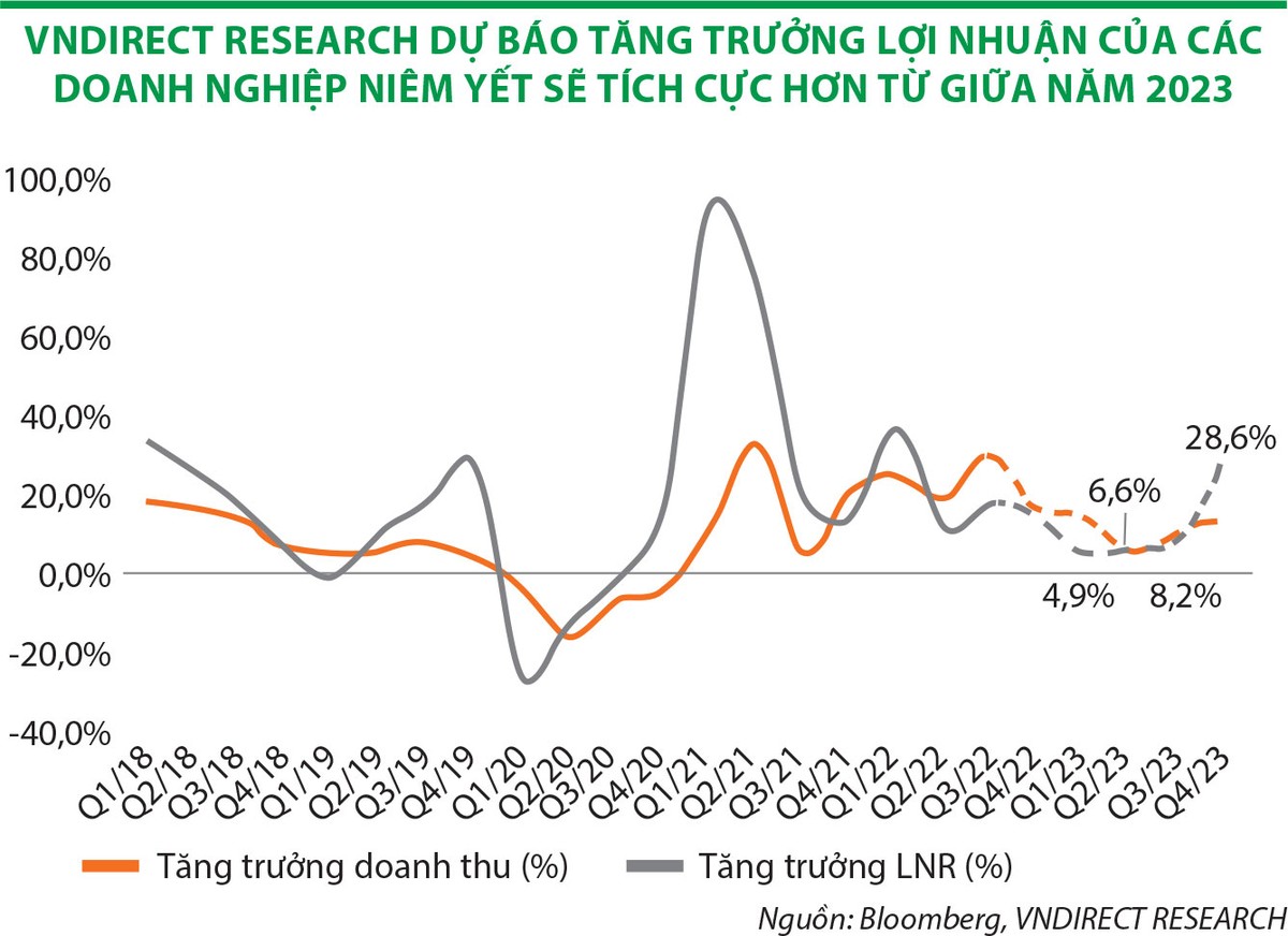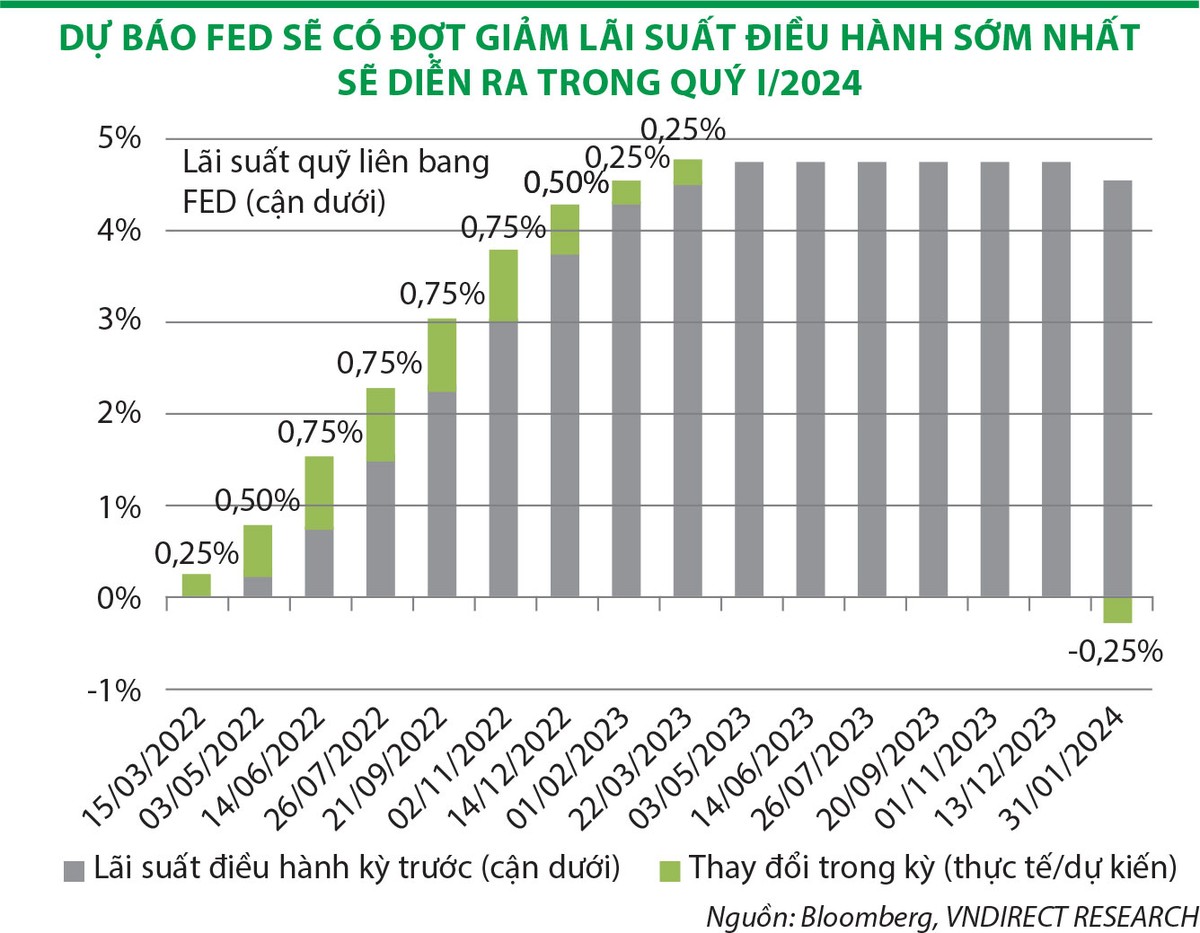 Bên cạnh đó, giá hàng hóa toàn cầu trên đà điều chỉnh mạnh do lo ngại suy thoái kinh tế. Do đó, chúng tôi cho rằng, áp lực lạm phát trên thế giới nhiều khả năng sẽ dễ thở hơn trong năm 2023, khi nguồn cung hàng hóa phục hồi, trong khi nhu cầu tiêu dùng suy yếu. Tuy nhiên, khả năng đảo chiều lãi suất điều hành của Cục Dự trữ liên bang Mỹ (Fed) sẽ khó xảy ra trong năm 2023, nếu như kinh tế Mỹ không rơi vào suy thoái. Nhiều khả năng, một đợt cắt giảm nhẹ 25 điểm cơ bản đầu tiên sẽ diễn ra trong quý I/2024.