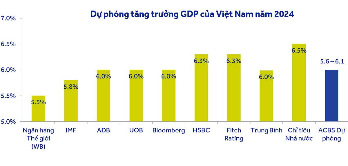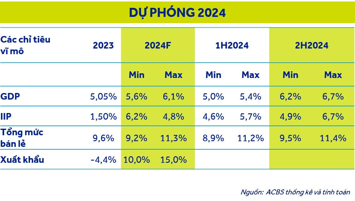 Trong năm 2024, chúng tôi dự báo Việt Nam có thể đạt mức tăng trưởng GDP từ 5,6 - 6,1% so với năm 2023, căn cứ trên các dự báo về xu hướng tiếp tục hồi phục của xuất khẩu, tiêu dùng bán lẻ và FDI. Đặc biệt, lĩnh vực đầu tư công tiếp tục được đẩy mạnh, có thể tạo ra ảnh hưởng tích cực lan tỏa đối với nền kinh tế. Tỷ giá ổn định, môi trường lãi suất tiếp tục được duy trì ở mức thấp, hỗ trợ cho các doanh nghiệp.