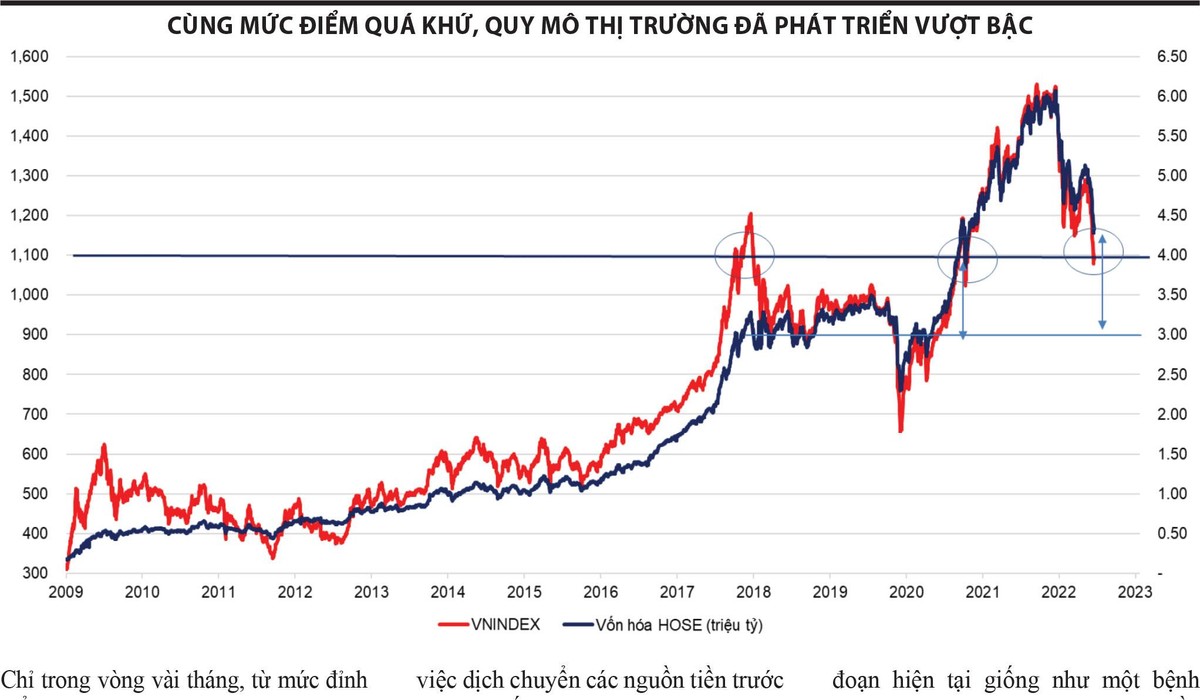 Cũng là mốc 1.100 điểm, 1.000 điểm hay thậm chí thấp hơn của chỉ số VN-Index, nhưng thị trường giai đoạn 2006 - 2.007 như một đứa trẻ mới đi học, 2010 - 2022 như một thiếu niên sắp dậy thì, thì năm 2022 đã là một người thanh niên trưởng thành.