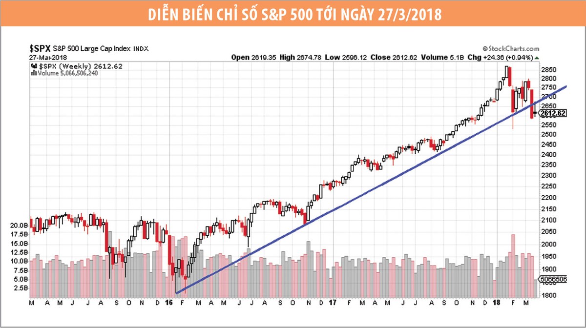 Thứ 2 vừa qua (26/3/2018), chứng khoán Mỹ đã có một phiên phục hồi, tuy nhiên có thể sẽ có 2 đợt phá vỡ đường xu hướng (giống như có 2 đỉnh trong đợt bật lại vừa qua) trước khi một cú sụt giảm mạnh thực sự bắt đầu. Khả năng chứng khoán Mỹ rơi sâu trong thời gian tới vẫn có xác suất xảy ra cao.