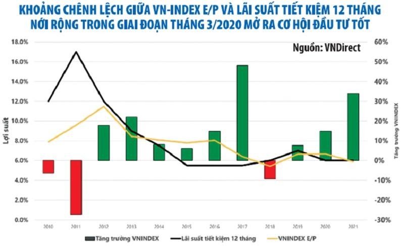 Thay vì sử dụng P/E, bà Trần Khánh Hiền, Giám đốc Nghiên cứu phân tích VNDirect so sánh giữa Tỷ lệ sinh lời của thị trường chia cho định giá hiện tại (E/P - con số đảo ngược của P/E) với lãi suất. “Định giá thị trường hiện tương đương lợi suất của thị trường sẽ rơi vào khoảng 7,7%, tức là một nhà đầu tư khi lựa chọn thị trường chứng khoán thì có thể mang về lợi nhuận 7,7%/năm. So với mức lãi suất tiền gửi hiện nay là 6%/năm, thì khoảng cách giữa lợi suất từ thị trường chứng khoán và lãi suất tiền gửi đang nới rộng”.
