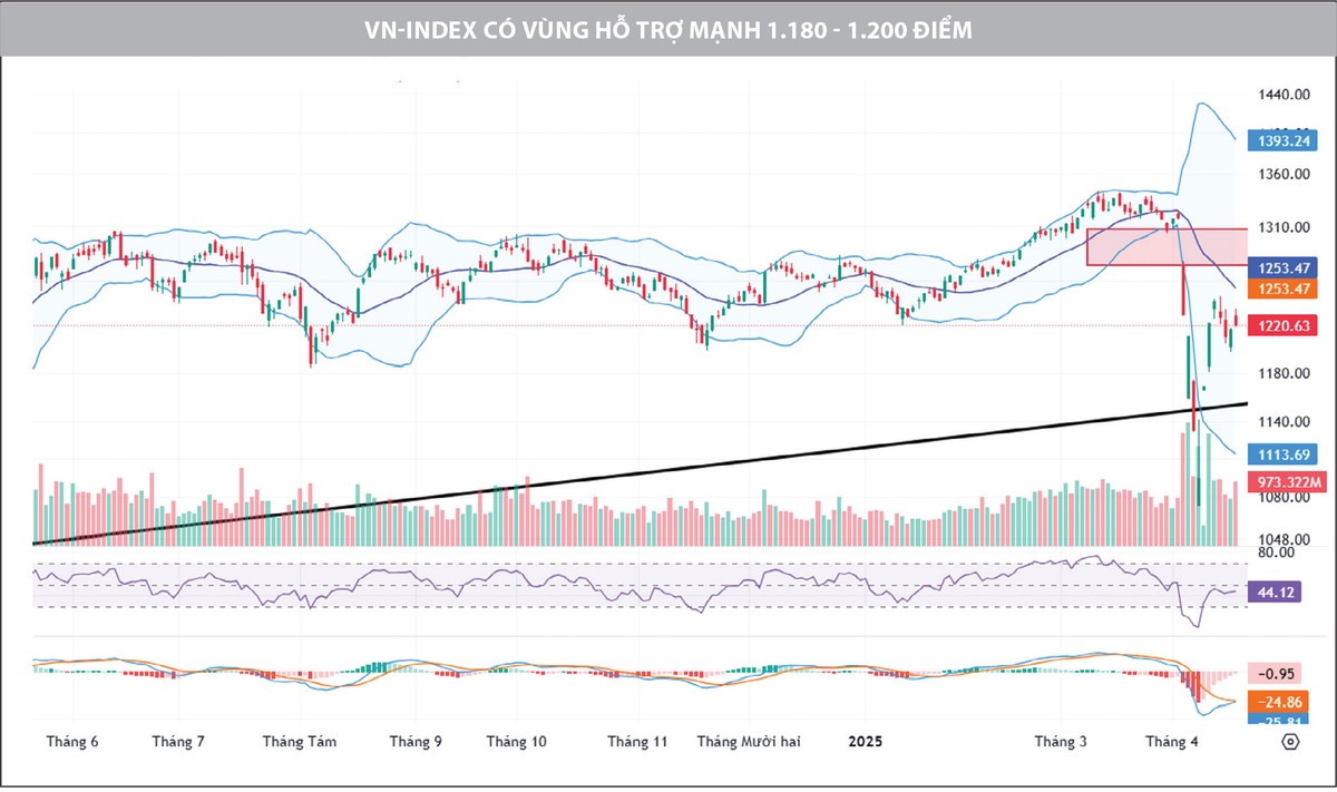 Chúng tôi nhận thấy, có sự ổn định trong hành vi mua bán quanh vùng hỗ trợ mạnh 1.180 - 1.200 điểm. Điều này không chỉ có ý nghĩa về mặt kỹ thuật, mà còn thể hiện tâm lý ổn định hơn do dòng tiền mua mang tính chất dài hạn hơn. Nếu vùng hỗ trợ này được giữ vững, thị trường có thể xác lập xu hướng phục hồi bền vững, với mục tiêu ngắn hạn là 1.250 điểm và trong trường hợp đàm phán tốt, mục tiêu xa hơn là vùng 1.300 điểm.