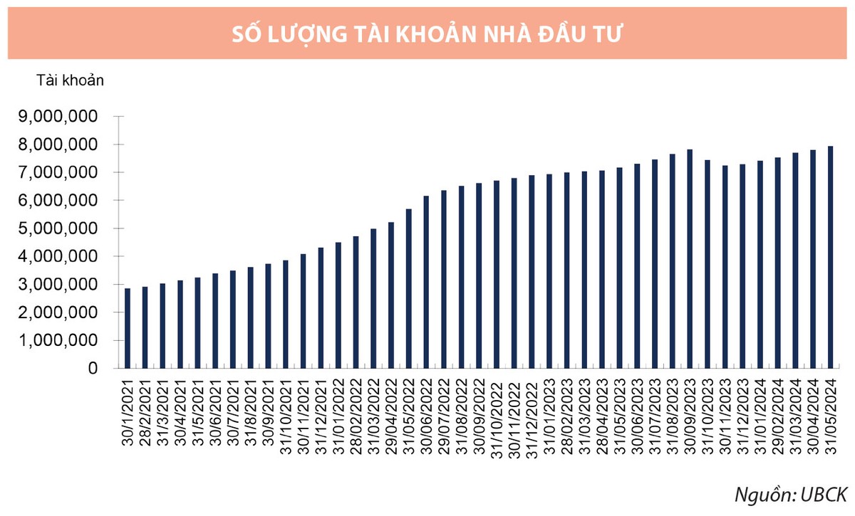 Bên cạnh đó, số lượng tài khoản nhà đầu tư mở mới tăng dần đều qua các năm, cho thấy sức hấp dẫn của thị trường chứng khoán. Cụ thể, số lượng nhà đầu tư tăng từ 3.000 tài khoản năm 2000 lên hơn 8 triệu tài khoản tính đến hết tháng 6/2024, tương đương 8% dân số.