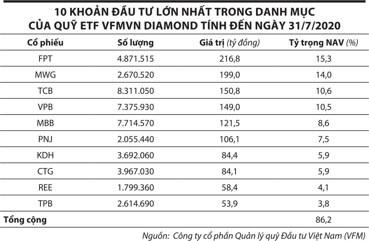 Trong tuần cuối tháng 8/2020, Quỹ ETF VFMVN Diamond (mã chứng khoán FUEVFVND) đã phát hành ròng 11,7 triệu chứng chỉ quỹ, tương ứng giá trị 6,4 triệu USD (khoảng 149 tỷ đồng).