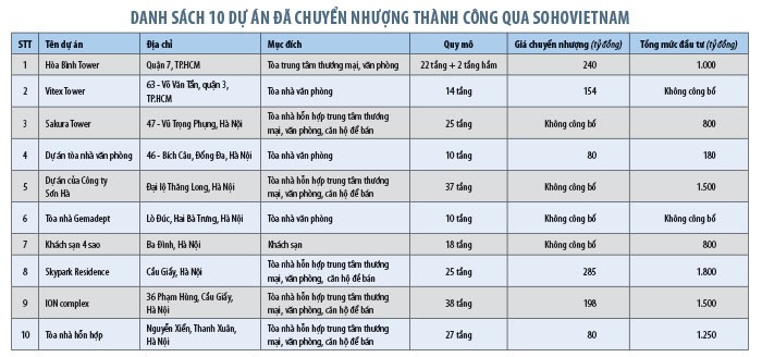 Theo báo cáo của RCA, một tổ chức chuyên về tư vấn các hoạt động giao dịch mua bán dự án, từ năm 2011 đến nay, hoạt động chuyển nhượng dự án bất động sản ngày càng gia tăng. Trung bình mỗi năm có khoảng 15 thương vụ được chuyển nhượng trên thị trường bất động sản Việt Nam. Các nhà đầu tư trong nước hiện vẫn chiếm ưu thế trong các thương vụ mua bán dự án thành công trong năm 2014, với 63% bên mua và 54% bên bán là các công ty trong nước.