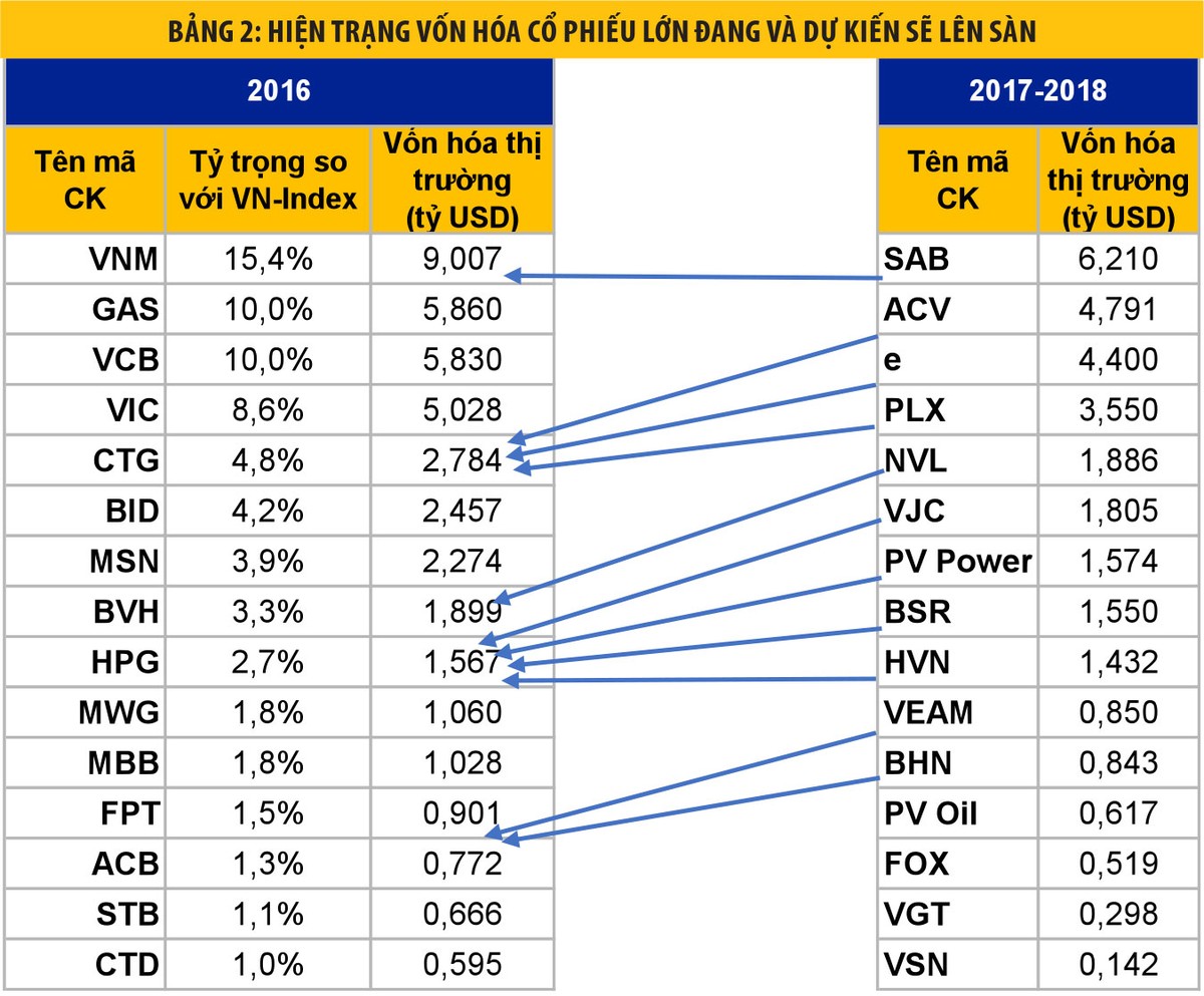 Nhà đầu tư đặt nhiều kỳ vọng vào quá trình thoái vốn nhà nước tại các DN niêm yết, nhất là các DN lớn như Vinamilk, FPT, Nhựa Bình Minh… và quá trình IPO đưa lên sàn các DNNN lớn như MobiFone (vốn hóa dự kiến 4,4 tỷ USD), Nhà máy lọc dầu Bình Sơn (vốn hóa dự kiến 1,6 tỷ USD), PV Power (vốn hóa dự kiến 1,6 tỷ USD), PV Oil (vốn hóa dự kiến 0,6 tỷ USD)...