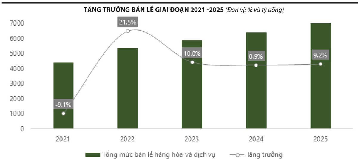 Ở góc độ vĩ mô, các số liệu mới nhất cho thấy bức tranh tiêu dùng trong nước đang từng bước cải thiện, qua đó tạo nền tảng tích cực cho nhóm cổ phiếu bán lẻ trong thời gian tới. Cụ thể, tổng mức bán lẻ hàng hóa và doanh thu dịch vụ tiêu dùng tháng 12/2025 ước đạt 627.800 tỷ đồng, tăng 9,8% so với cùng kỳ; tính chung cả năm, quy mô bán lẻ đạt hơn 7 triệu tỷ đồng, tương ứng mức tăng 9,2% so với năm 2024.