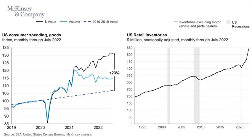 Trong báo cáo gần nhất của McKinsey & Company, tổng giá trị hàng tồn kho các nhà bán lẻ của Mỹ trong nửa đầu năm 2022 đã tăng vọt từ mức 400 triệu tại thời điểm cuối năm 2021 lên tới 550 triệu đô-la Mỹ trong bối cảnh mà chi tiêu dùng cho hàng hóa giảm mạnh phần do thay thế bởi chi tiêu cho dịch vụ tăng lên kể từ khi đại dịch được kiểm soát, các lệnh cấm túc được dỡ bỏ (hình minh họa).