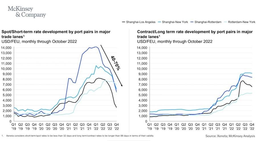 Phân tích thị trường của McKinsey & Company trong bản báo cáo gần nhất cho thấy, mức cước giao ngay (spot rate) giảm mạnh từ 40-70% so với đầu năm trên hầu hết các tuyến hải trình thuộc hành lang Đông-Tây cũng như Á – Âu.