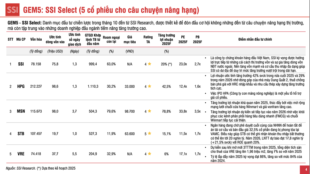 Mới đây, SSI Research có khuyến nghị 5 cổ phiếu trong Danh mục đầu tư chiến lược trong tháng 10, được thiết kế để đón đầu cơ hội không những đến từ câu chuyện nâng hạng thị trường, mà còn tập trung vào những doanh nghiệp đầu ngành tiềm năng tăng trưởng cao.