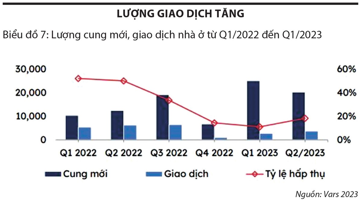 Theo dữ liệu của Hội Môi giới bất động sản Việt Nam (VARS) công bố mới đây, nếu như quý I/2023 chỉ có hơn 1.000 sản phẩm được giao dịch trên toàn quốc thì sang quý II/2023 tăng lên khoảng 3.700 giao dịch thành công và tới quý III/2023, lượng tiêu thụ đạt khoảng 5.770 giao dịch, chiếm xấp xỉ 28% tổng cung mở bán mới và gần bằng 90% so với cùng kỳ năm 2022.