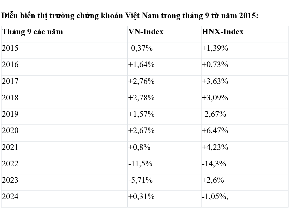Tháng 9 gần nhất vào năm 2024, thị trường giao dịch khá ảm đạm, chỉ số VN-Index tăng nhẹ từ gần 1.284 điểm lên 1.288 điểm, tương đương +0,31%.
