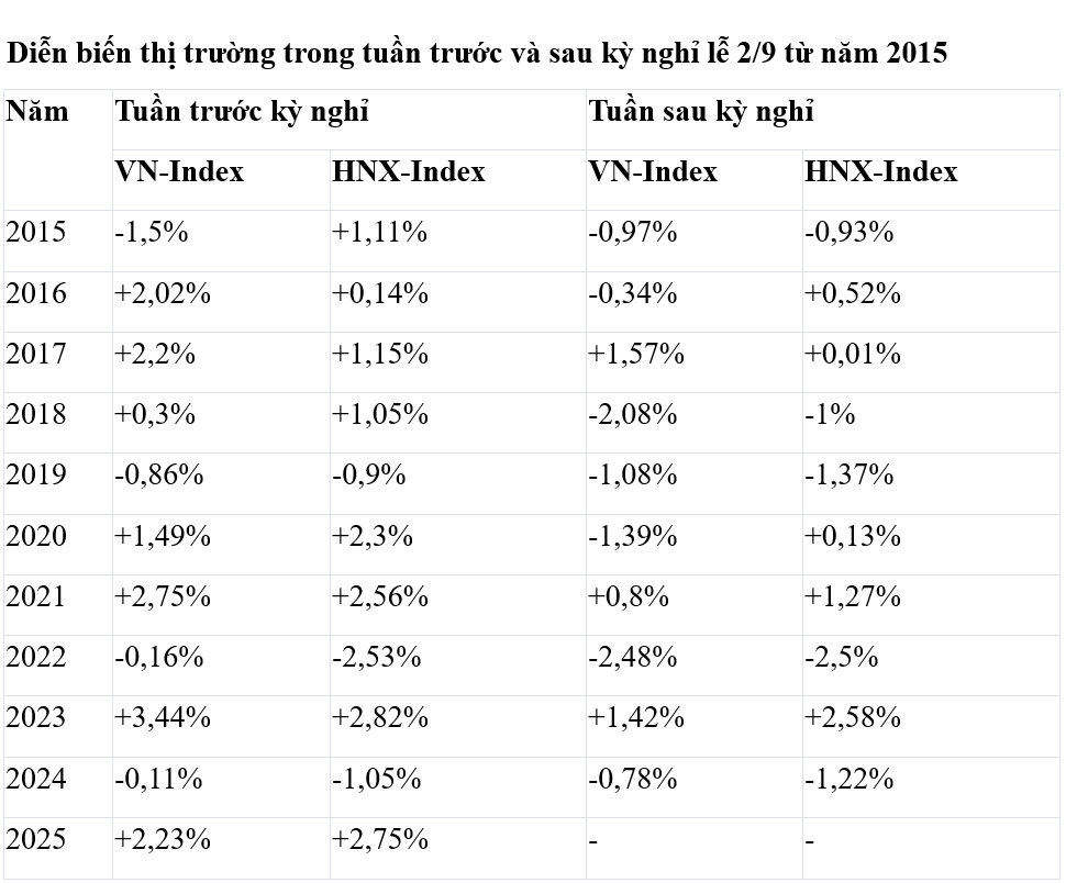 Theo thống kê của Báo Đầu tư Chứng khoán, trong khoảng thời gian 10-11 năm gần nhất trước kỳ nghỉ lễ Quốc khánh 2/9, chỉ số VN-Index đã có 7 tuần tăng và 4 tuần giảm, trong khi HNX-Index có 8 tuần tăng và 3 tuần giảm.
