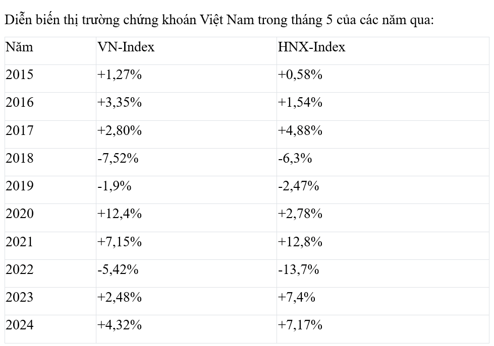 Mặc dù vậy, theo thống kê của Báo đầu tư Chứng khoán, trong tháng 5 của 10 năm giao dịch gần nhất, hiệu ứng “Sell In May” đã bị lấn át bởi “Buy In May”, khi có tới 7 lần tăng và chỉ 3 lần giảm.