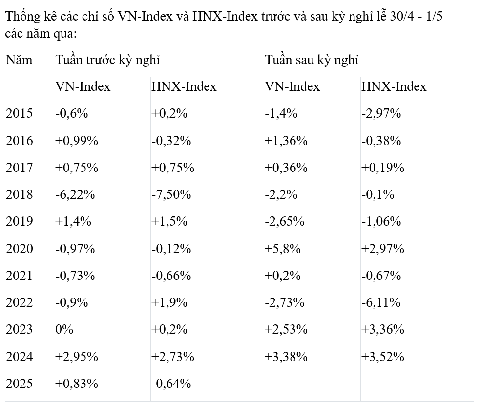 Về diễn biến các chỉ số chính, nếu xét riêng về tuần giao dịch trước kỳ nghỉ lễ 30/4 và 1/5, theo thống kê của Báo Đầu tư Chứng khoán, từ năm 2015 đến nay, VN-Index tương đối cân bằng với 5 lần tăng, 5 lần giảm và năm 2023 gần như không đổi.