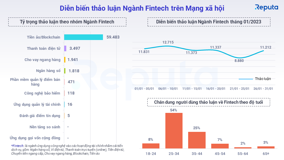 Trong tháng 01 vừa qua, Tiền ảo/ Blockchain có tỷ lệ thảo luận vượt trội hơn so với các thảo luận khác, gấp 17 lần so với Thanh toán điện tử. Diễn biến thảo luận ngành có xu hướng tăng lên vào các ngày cuối tháng 1 và đạt đỉnh với 12.715 thảo luận. Độ tuổi thảo luận nhiều nhất từ 25 đến 34 tuổi, chiếm 54% trong tổng số người dùng thảo luận về Fintech. Đây cũng là đối tượng sử dụng các ứng dụng fintech như thanh toán điện tử nhiều nhất.