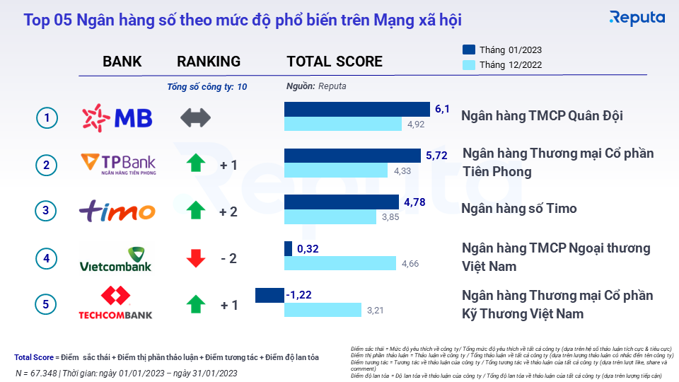 Nhìn chung, top 5 Bảng xếp hạng tháng 02/2023 lượng thảo luận đang có chiều hướng tăng lên. TP Bank vượt lên top 2, tăng 32%, đạt 5,72 điểm Total Score thông qua các bài viết nổi bật.