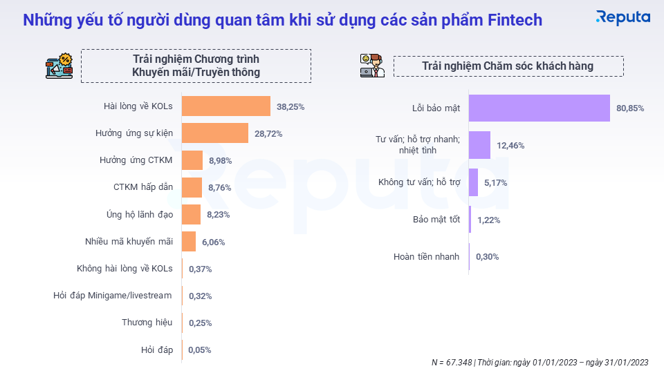Trong các yếu tố người dùng quan tâm khi sử dụng, người dùng các sản phẩm Fintech thường quan tâm nhiều đến các hoạt động quảng bá từ KOLs và các sự kiện, chiếm hơn 66% lượng quan tâm. Trong khi đó, lỗi bảo mật là yếu tố mà người dùng quan tâm trong trải nghiệm Chăm sóc khách hàng, chiếm 80,85% lượng thảo luận.
