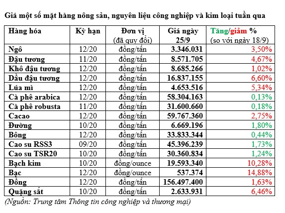 Hòa cùng nhịp tăng chung, cà phê ghi nhận sự hồi phục nhẹ. Giá cà phê arabica kỳ hạn tháng 12/2020 trên sàn ICE tăng 2,2% lên 1,1365 USD/lb vào ngày 25/9, hồi phục từ mức thấp nhất 2 tháng (1,0905 USD/lb) trong ngày 23/9. Tính cả tuần, cà phê arabica tăng 0,13%, trong khi tuần trước đó giảm hơn 14%.