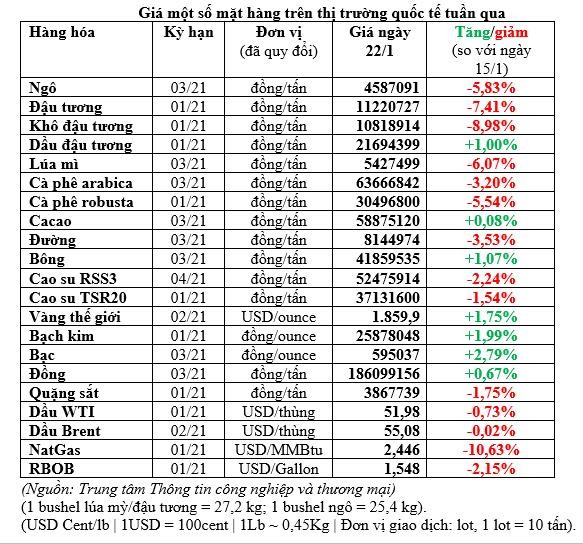 Ở nhóm kim loại công nghiệp, giá đồng trong phiên 22/1 giảm do chịu ảnh hưởng từ các thị trường chứng khoán, dầu mỏ và cũng bởi thông tin số ca nhiễm Covid-19 ở Trung Quốc đang tăng nhanh, cho dù đà giảm được hạn chế bởi thông tin hoạt động ở các nhà máy Mỹ tháng 1/2021 đạt mức cao nhất gần 14 năm.
