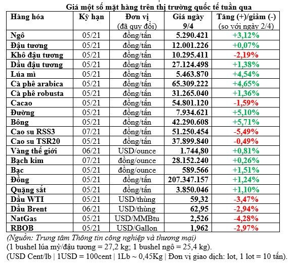 Kết thúc phiên 9/4, giá đường trắng kỳ hạn tháng 5/2021 trên sàn London giảm 2,2 USD (-0,5%) xuống 422,5 USD/tấn; giá đường thô kỳ hạn tháng 5/2021 trên sàn ICE tăng 0,28 US cent (+1,8%) lên 15,46 US cent/lb, trong phiên có thời điểm đạt 15,72 US cent/lb - cao nhất gần 3 tuần và tính cả tuần tăng tới hơn 5%.