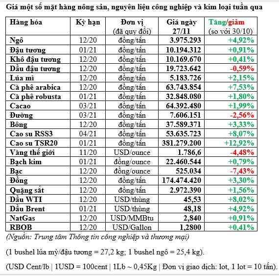 Thông tin về vắc-xin Covid-19 cũng ảnh hưởng tích cực lên giá dầu. Kết thúc tuần từ 20-27/11, giá dầu Brent tăng lên 48,18 USD/thùng, tương đương tăng gần 5%; giá dầu thô Mỹ (WTI) tăng lên 45,53 USD/thùng, tăng tới hơn 8% so với đầu tuần.