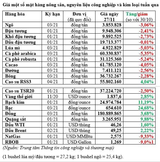 Tương tự, giá đậu tương kỳ hạn tháng 1/202 trên sàn Chicago giảm 0,2% xuống 11,65-1 USD/bushel.