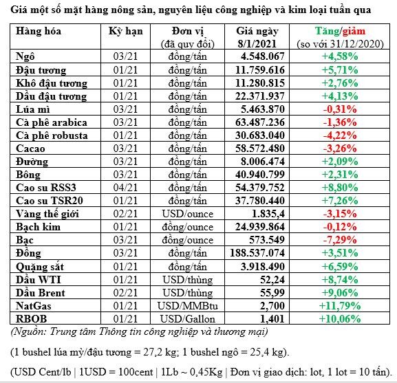 Ngô CBOT giao tháng 3/2021 cũng tăng 2-1/4 US cent lên 4,96-1/4 USD/bushel. Lúa mì cùng kỳ hạn giảm 3-1/2 US cent đóng cửa tại 6,38-3/4 USD/bushel.