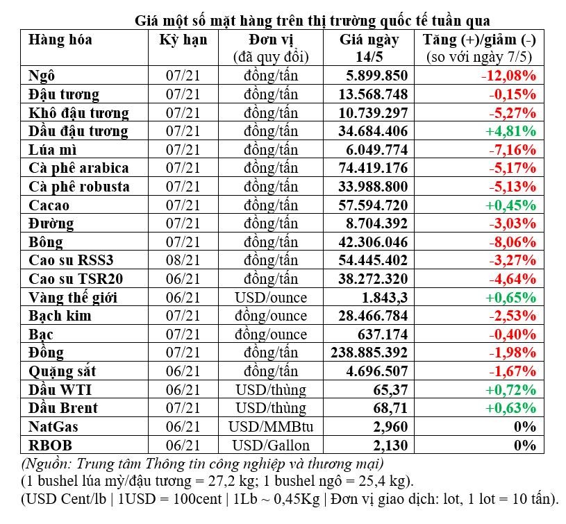 Với mặt hàng cà phê, phiên 14/5, giá arabica kỳ hạn tháng 7/2021 trên sàn ICE giảm 1,4 US cent (-1%) xuống 1,45 USD/lb; robusta kỳ hạn tháng 7/2021 giảm 31 USD (-2,1%) xuống 1.417 USD/tấn. Tính chung, cả 2 loại cà phê cùng giảm hơn 5% trong tuần qua.